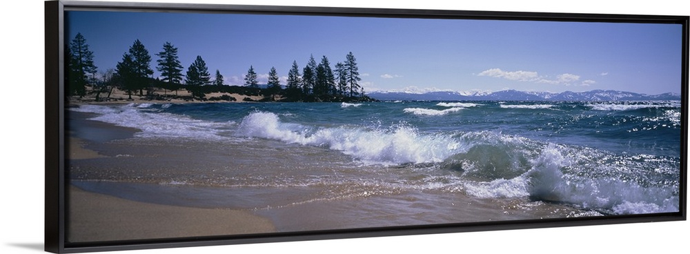 <p>Panoramic photograph shows the waves of a large body of water in Nevada crashing against a sandy shoreline scattered with trees on a sunny day. In the far distance, a snow-capped mountain range can be seen spanning the horizon.</p>