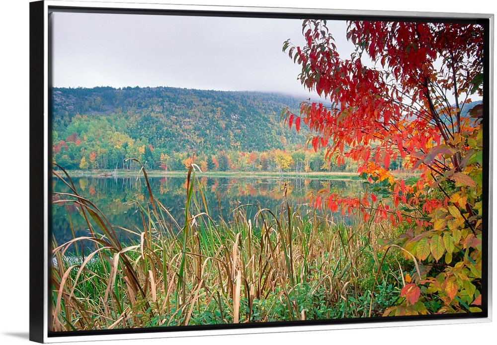 <p>A large photograph taken of a lake with tall grass and trees in the foreground. Autumn colored trees show on the other side of the lake with a large hill behind it.</p>