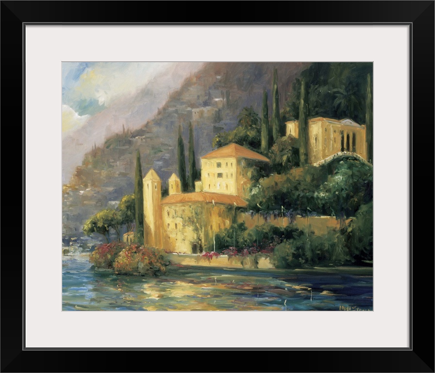 <p>Painting of a villa on the water's edge in Italy.</p>