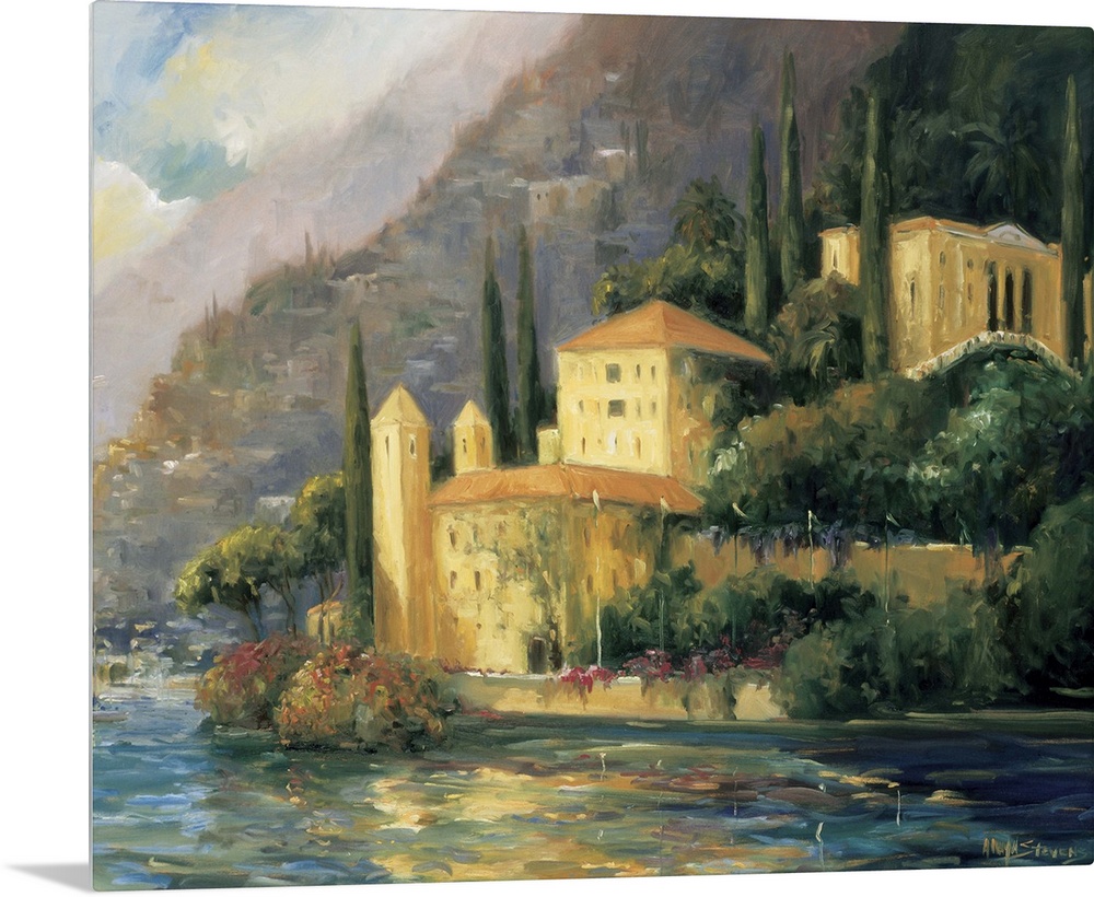 <p>Painting of a villa on the water's edge in Italy.</p>