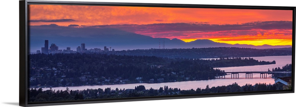 <p>United States, Washington, Lake Washington, Mercer Island, Seattle skyline, and Olympic mountains viewed from Bellevue at sunset.</p>