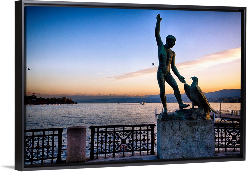 <p>Statue of Ganymed on the Zurich Lake at Sunset, Switzerland</p>