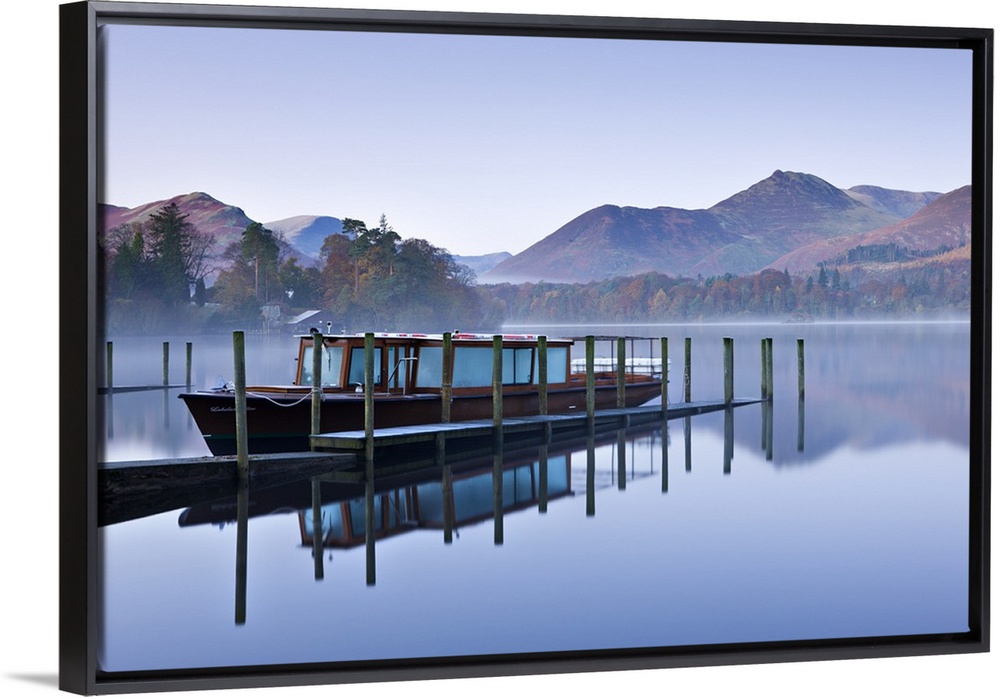 <p>Lakeland Mist pleasure boat moored on a placid Derwent Water on a misty and frosty morning, Keswick, Lake District National Park, Cumbria, England, UK. Autumn, November, 2009.</p>