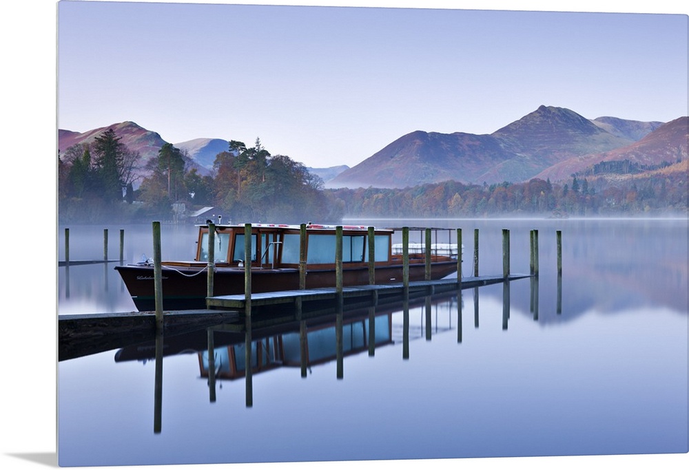 <p>Lakeland Mist pleasure boat moored on a placid Derwent Water on a misty and frosty morning, Keswick, Lake District National Park, Cumbria, England, UK. Autumn, November, 2009.</p>