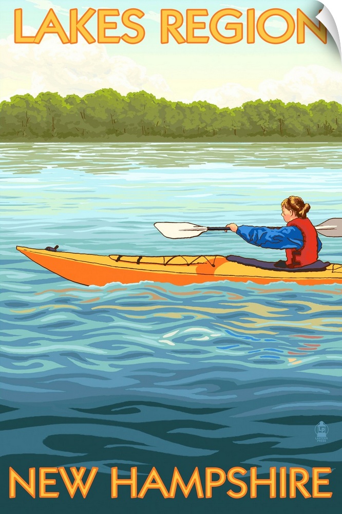 <p>Retro stylized art poster of a woman in a kayak on a clear blue lake.</p>