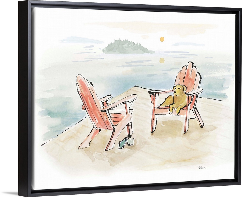 <p>Watercolor painting of a yellow lab relaxing on a chair at the lake.</p>