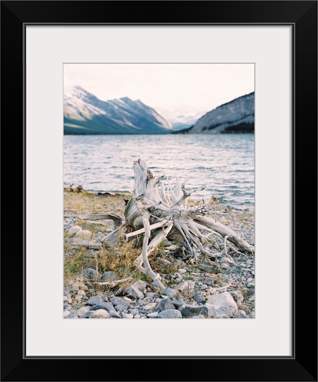 <p>Photograph of driftwood on the shore of Moraine Lake, Banff, Canada.</p>
