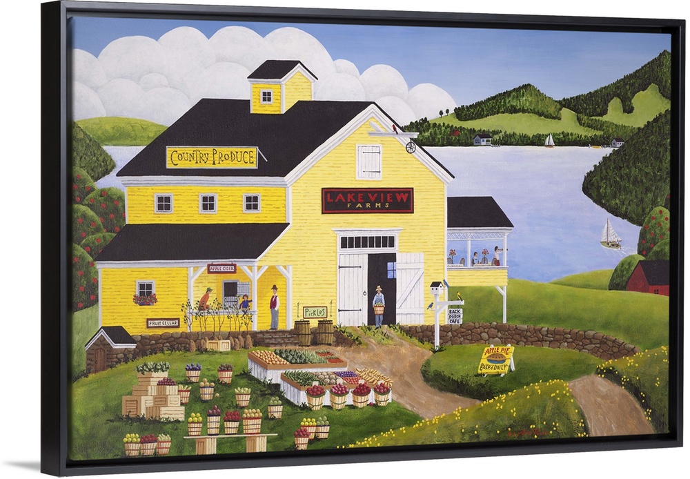 <p>Americana scene of a yellow farmhouse selling fresh produce and apple pies.</p>
