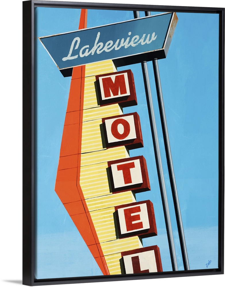 <p>Painting of a vintage motel sign with a diamond shaped decorative element, against a bright blue cloudless sky.</p>