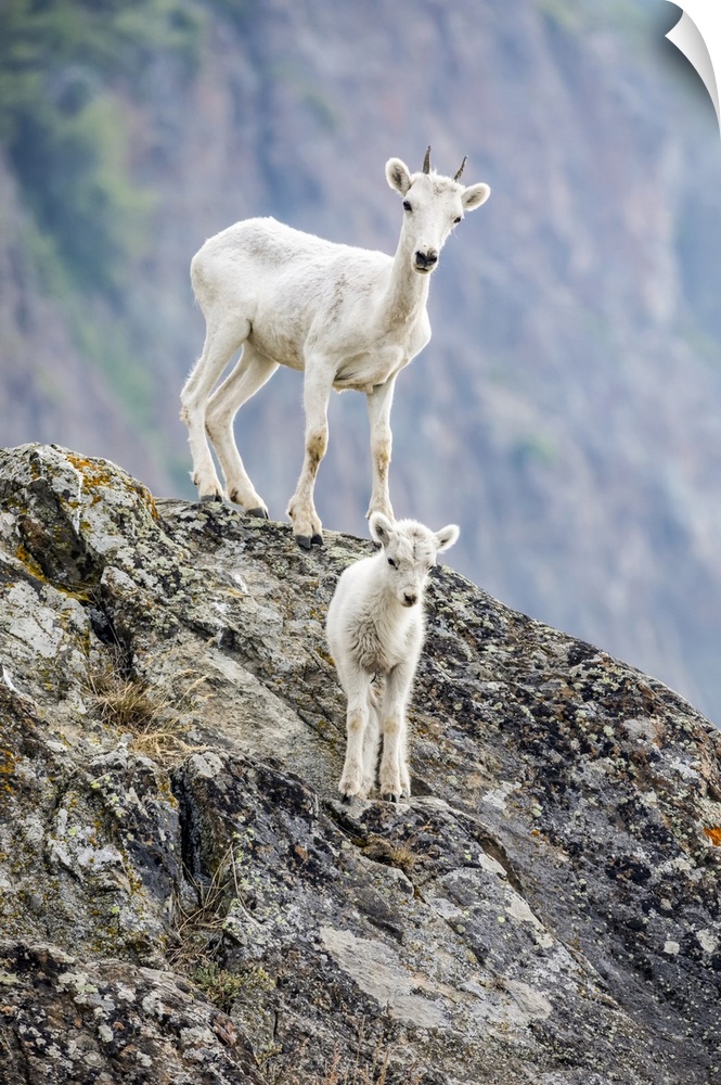 <p>A lamb and an older Dall sheep (Ovis dalli) look at camera from their rocky hillside in the Windy Point area of the Chugach Mountains, South-central Alaska; Alaska, United States of America</p>