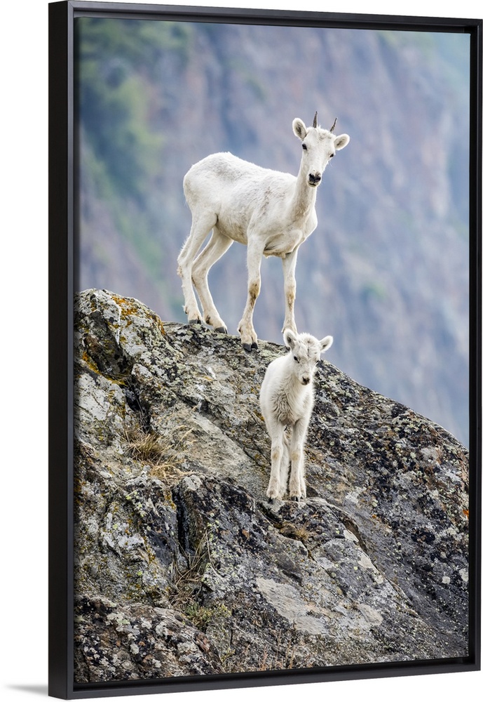 <p>A lamb and an older Dall sheep (Ovis dalli) look at camera from their rocky hillside in the Windy Point area of the Chugach Mountains, South-central Alaska; Alaska, United States of America</p>