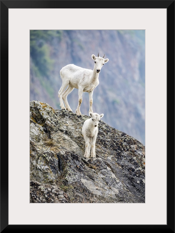<p>A lamb and an older Dall sheep (Ovis dalli) look at camera from their rocky hillside in the Windy Point area of the Chugach Mountains, South-central Alaska; Alaska, United States of America</p>