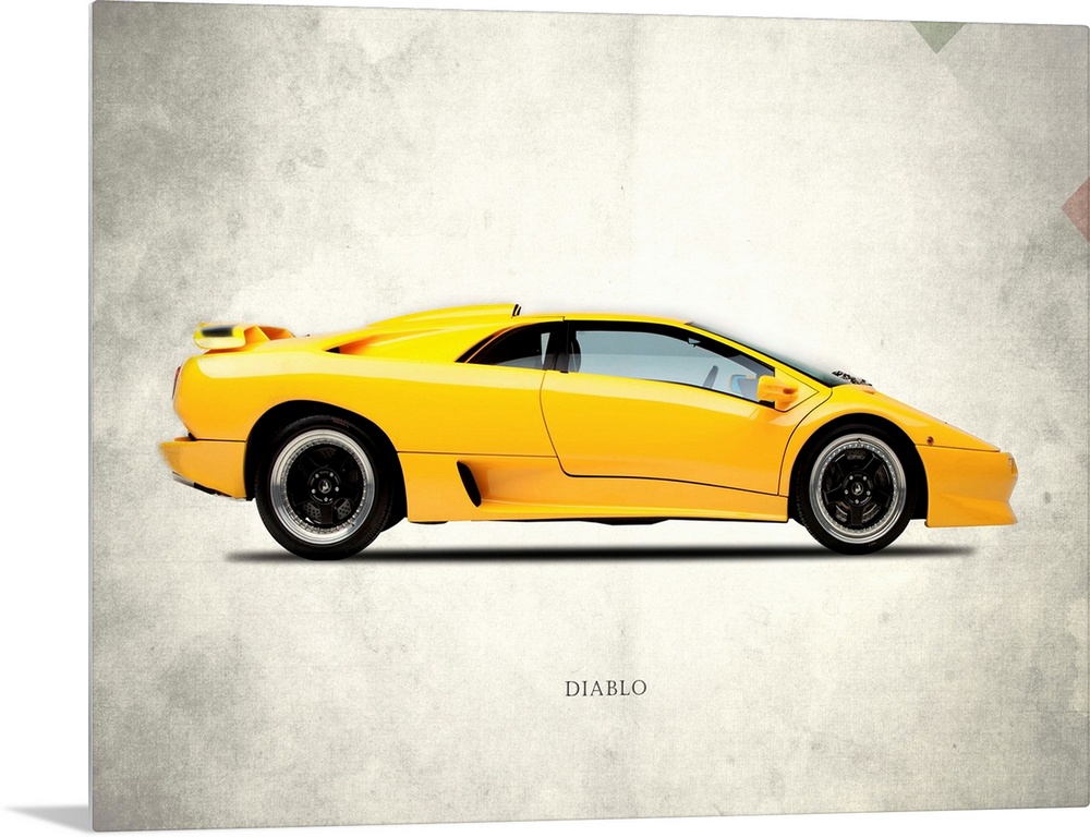 <p>Photograph of a yellow Lamborghini Diablo 1988 printed on a distressed white and gray background with part of the Italian flag in the top right corner.</p>