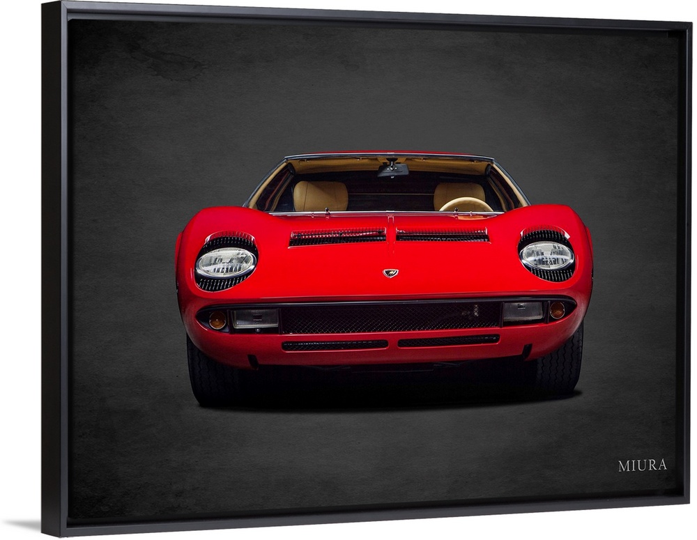 <p>Photograph of a red Lamborghini Miura printed on a black background with a dark vignette.</p>