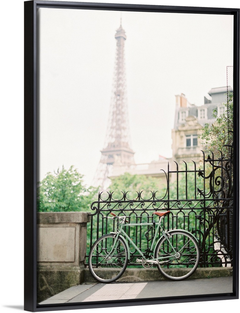 <p>Photograph of a bicycle leaning against an ornate metal railing with the Eiffel tower in the distance.</p>