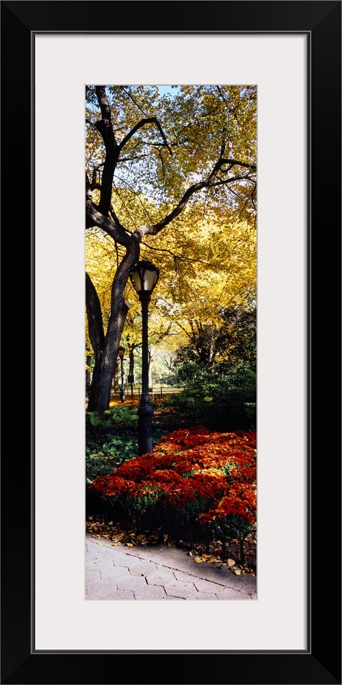 <p>Large vertical panoramic photograph of a single lamppost surrounded by flowers and trees in Central Park, Manhattan, New York City, New York (NY).</p>