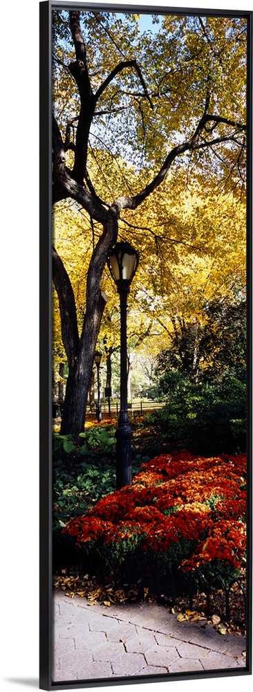 <p>Large vertical panoramic photograph of a single lamppost surrounded by flowers and trees in Central Park, Manhattan, New York City, New York (NY).</p>