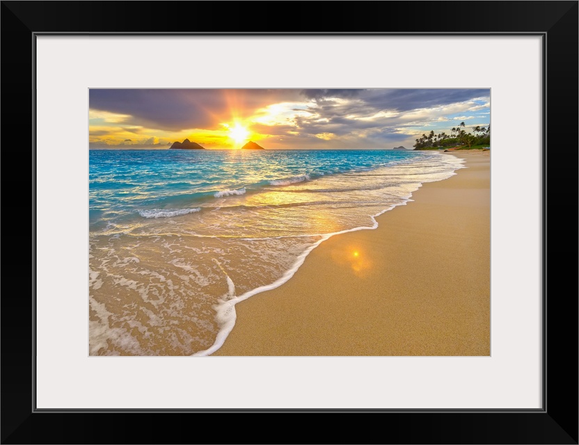 <p>Lanakai Beach at sunrise, with the surf washing up on the golden sand and a view of the Mokulua Islands in the distance; Oahu, Hawaii, United States of America.</p>