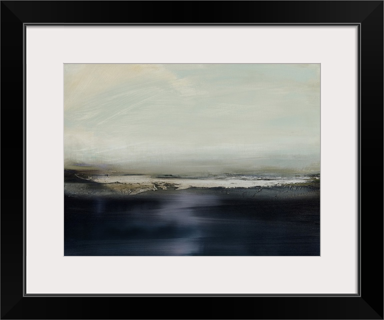 <p>Abstract artwork representing land and sky with blue-black color as the land and green-beige color as the sky. There are thick beige brush strokes in the center.</p>