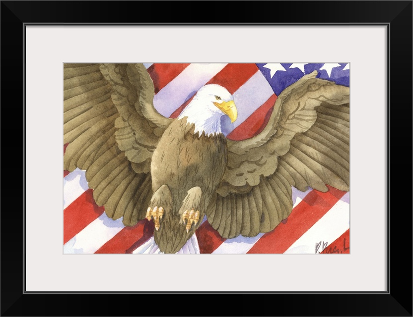 <p>Watercolor painting of a majestic bald eagle flying in front of an American Flag.</p>
