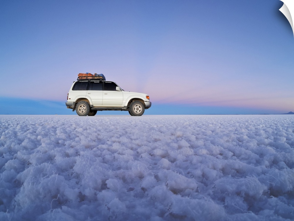 <p>Bolivia, Potosi Department, Daniel Campos Province, White Toyota Landcruiser on the Salar de Uyuni, the largest salt flat in the world at sunset.</p>