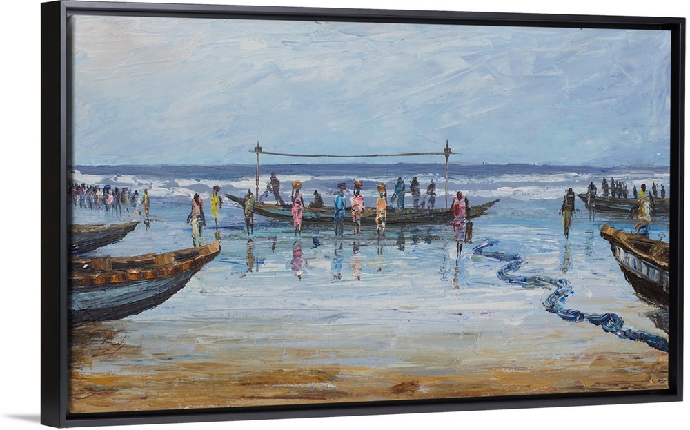 <p>Fishermen beach their boats on the sands of a Ghanaian beach. After a departure at dawn, they sell their catch to passersby in time for the family meal. Francis Amoah depicts an everyday scene in vivid color, effectively communicating the beauty of honest work.</p>