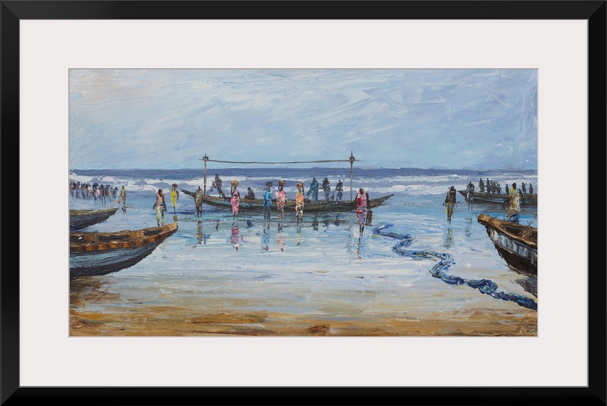 <p>Fishermen beach their boats on the sands of a Ghanaian beach. After a departure at dawn, they sell their catch to passersby in time for the family meal. Francis Amoah depicts an everyday scene in vivid color, effectively communicating the beauty of honest work.</p>