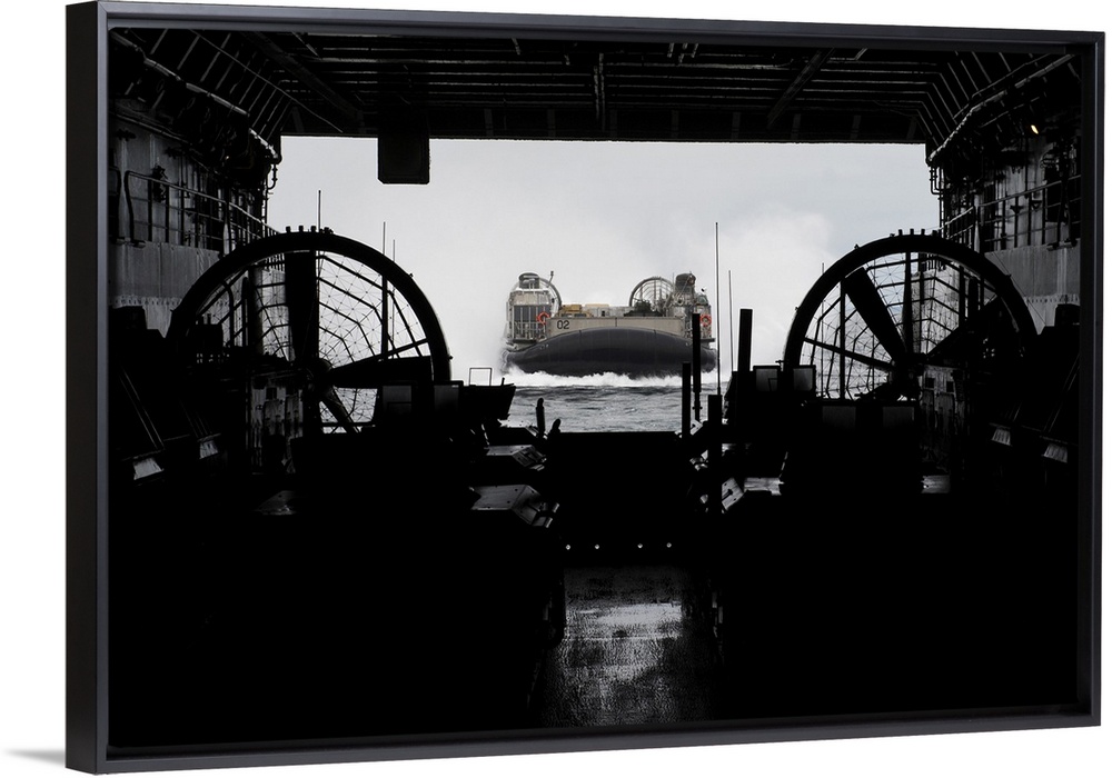 <p>Atlantic Ocean, January 25, 2013 - Landing Craft Air Cushion approaches the well deck of the amphibious transport dock ship USS San Antonio.</p>