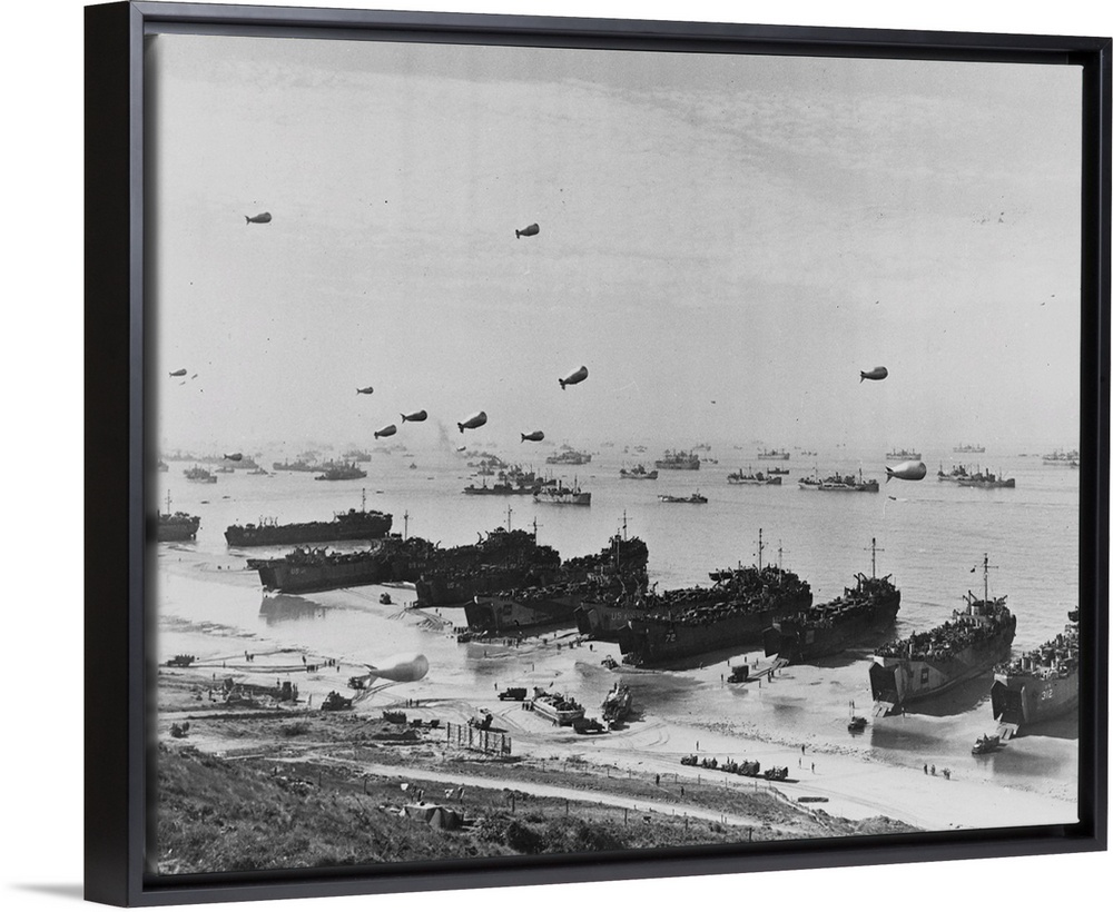 <p>A panoramic view of Omaha beach during the Normandy Landings. Barrage balloons hover over assembled warships as the Allies pour in an unending flow of supplies for the armies ashore. Though the US floating harbour was wrecked by a storm, the British unit continued.</p>