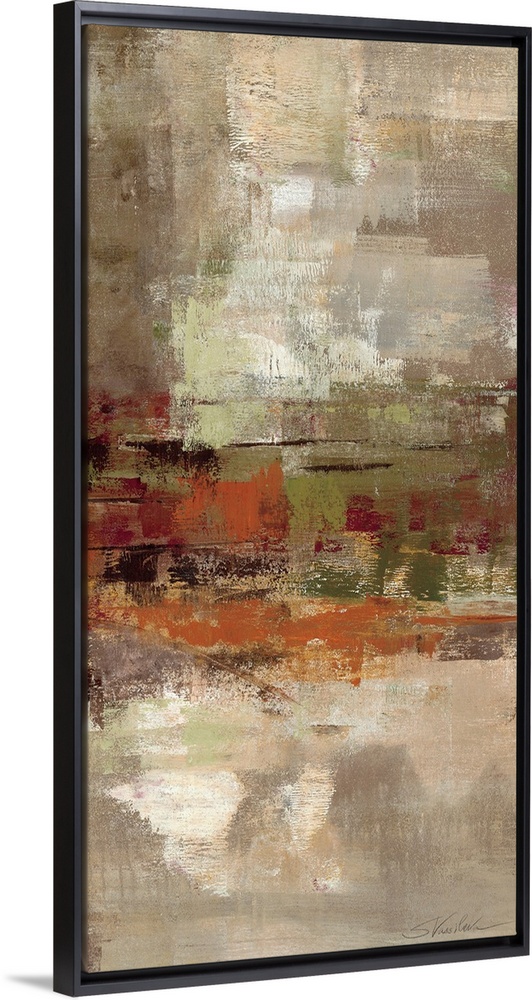 <p>Vertical abstract artwork with brushstrokes mainly being applied horizontally. A cluster of different colors is in the center while above and below are neutral colors.</p>