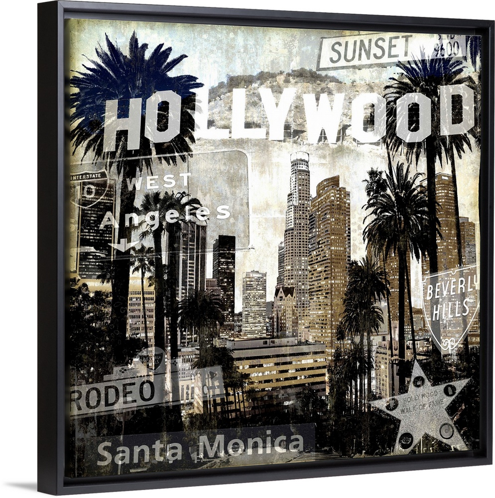 <p>Square home decor with a cityscape of LA/Hollywood in black and sepia tones with well-known street signs all over.</p>
