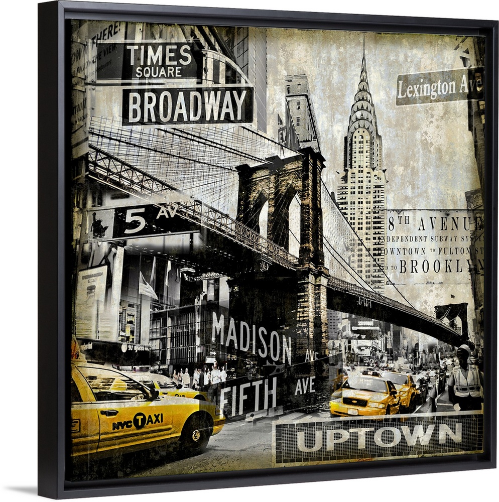 <p>Square home decor with a cityscape of New York City in black and sepia tones with yellow taxi cabs.</p>