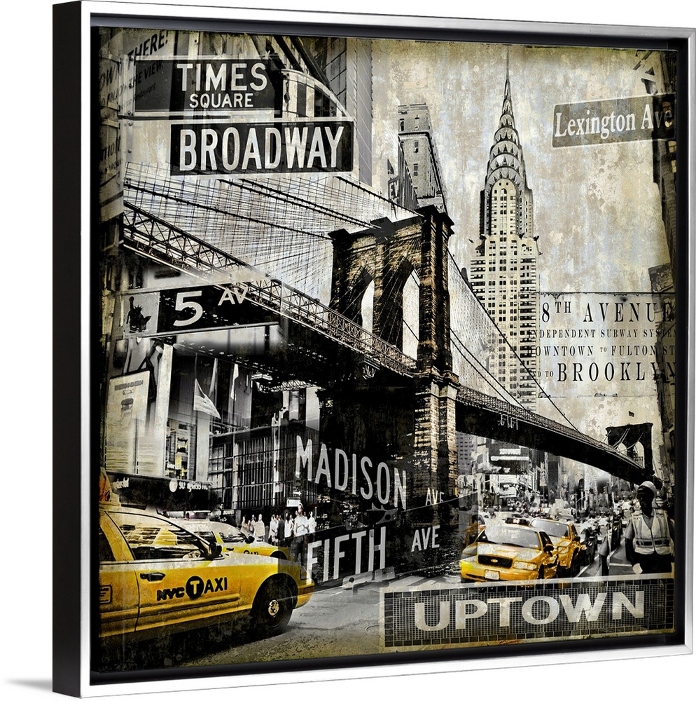<p>Square home decor with a cityscape of New York City in black and sepia tones with yellow taxi cabs.</p>