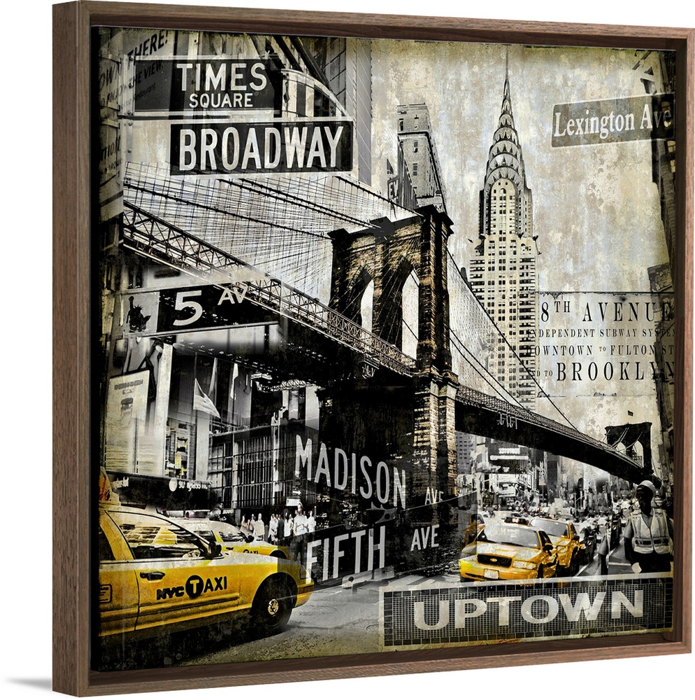 <p>Square home decor with a cityscape of New York City in black and sepia tones with yellow taxi cabs.</p>
