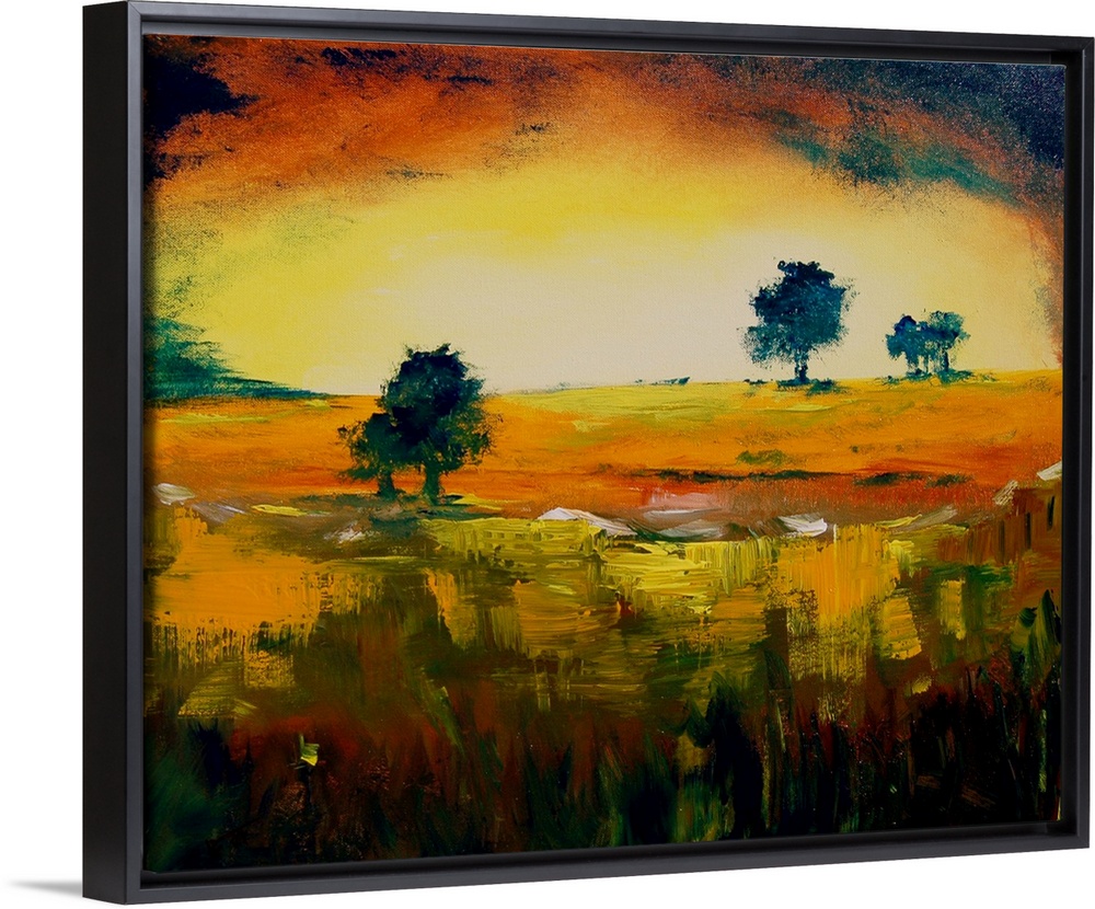 <p>A horizontal landscape of rolling fields with a few trees in vibrant, warm colors.</p>