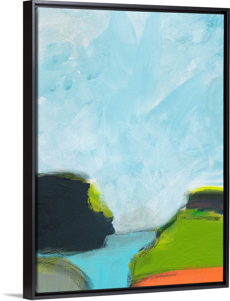 <p>Abstract landscape painting in cool shades of blue, green, and orange.</p>