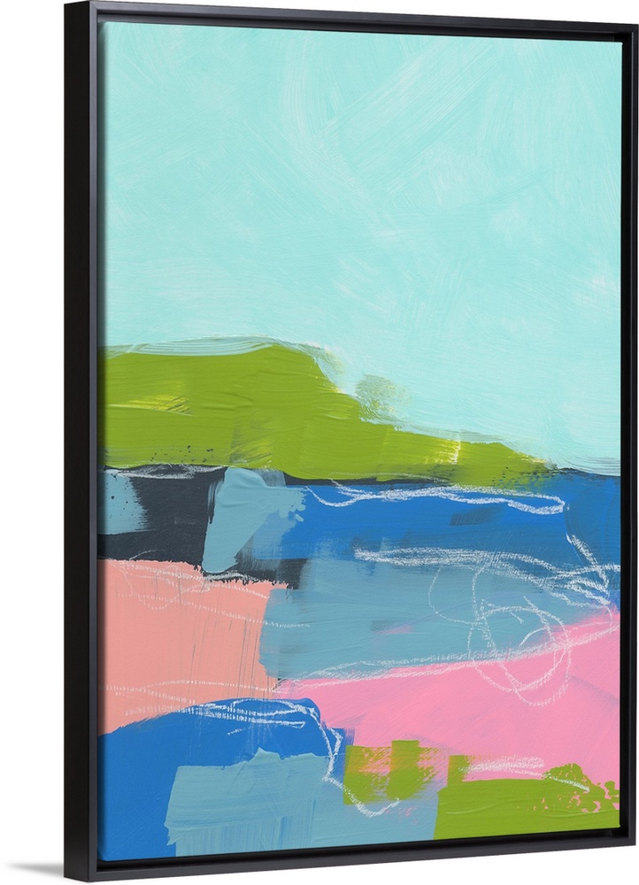 <p>Abstract landscape painting in cool shades of blue, green, and pink.</p>