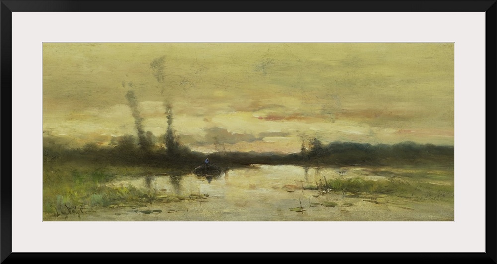 <p>Landscape at Hilversum, by Johannes Gijsbert Vogel, 1880-1915, Dutch painting, oil on canvas. Marsh with a boat near sunset or sunrise.</p>