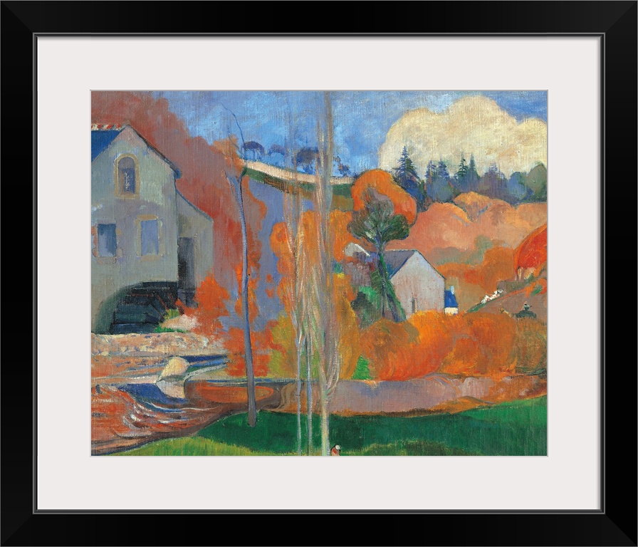 <p>Landscape in Brittany The David Mill, by Paul Gauguin, 1894, 19th Century, oil on canvas, cm 73 x 92 - France, Ile de France, Paris, Muse dOrsay. Detail. Landscape of Brittany cloud sky mountain house mill light blue azure green orange tree road red river</p>