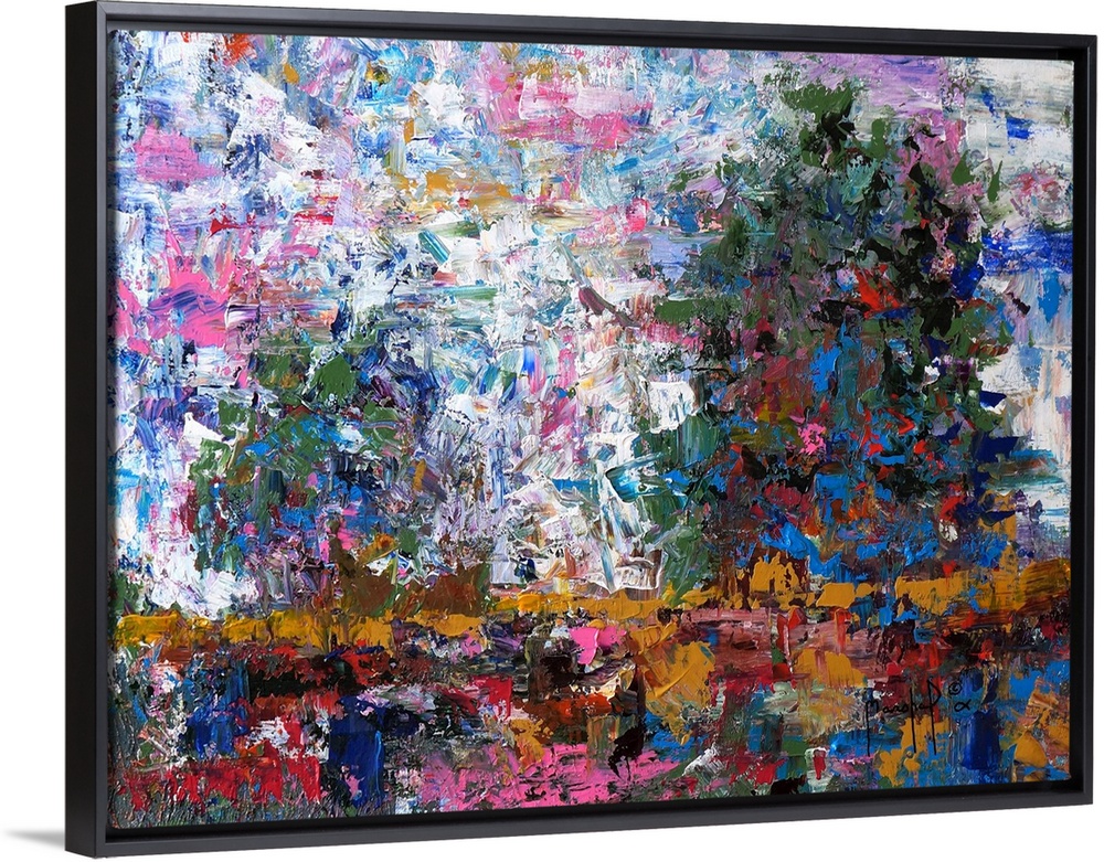 <p>Colorful abstract painting of a landscape with two trees, created with small, layered brushstrokes in every direction.</p>