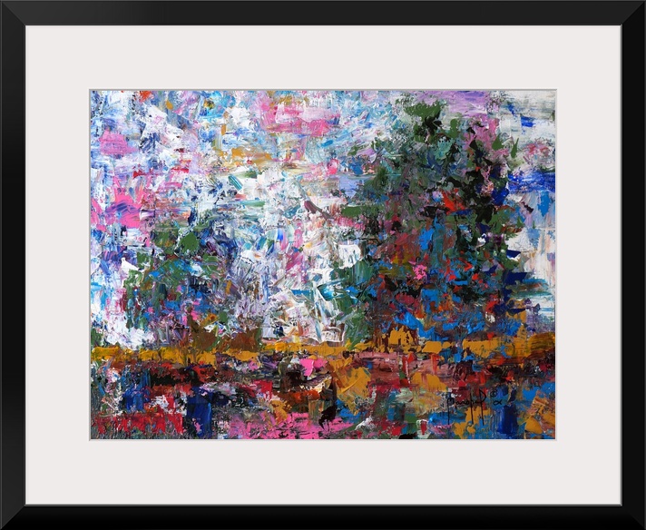 <p>Colorful abstract painting of a landscape with two trees, created with small, layered brushstrokes in every direction.</p>