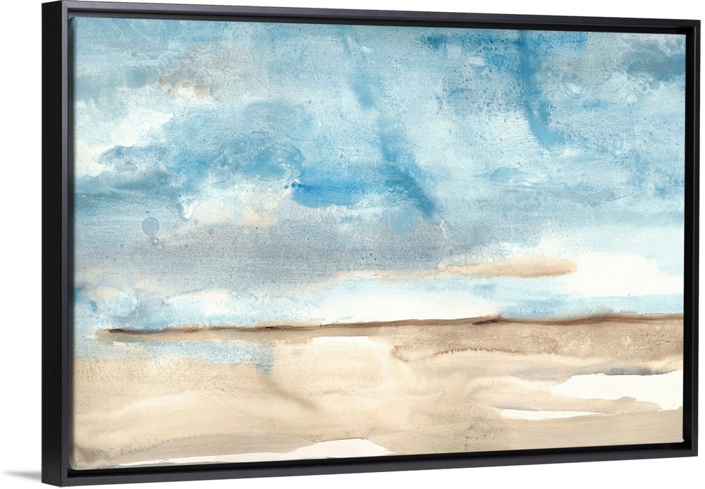 <p>Contemporary landscape watercolor painting with a blue sky and beige ground.</p>