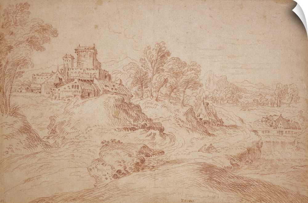 <p>Landscape with a castle, 1716-18, red chalk on buff laid paper, laid down on cream laid card.</p>