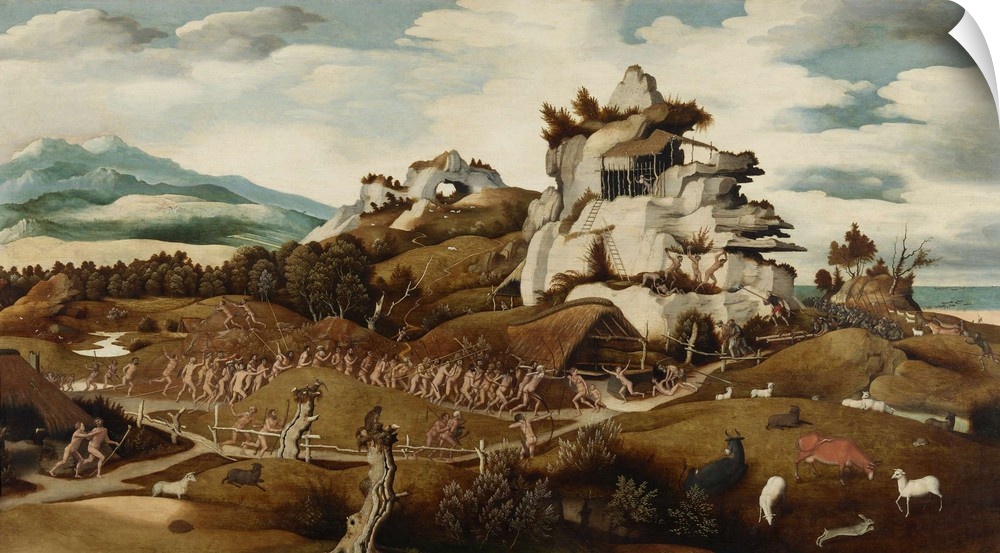 <p>Landscape with an Episode from the Conquest of America, by Jan Mostaert, c. 1535, Netherlandish painting, oil paint. Spanish soldiers battling the indigenous people of parts of Central America and the Caribbean. Mostaert added unusual elements to create a</p>