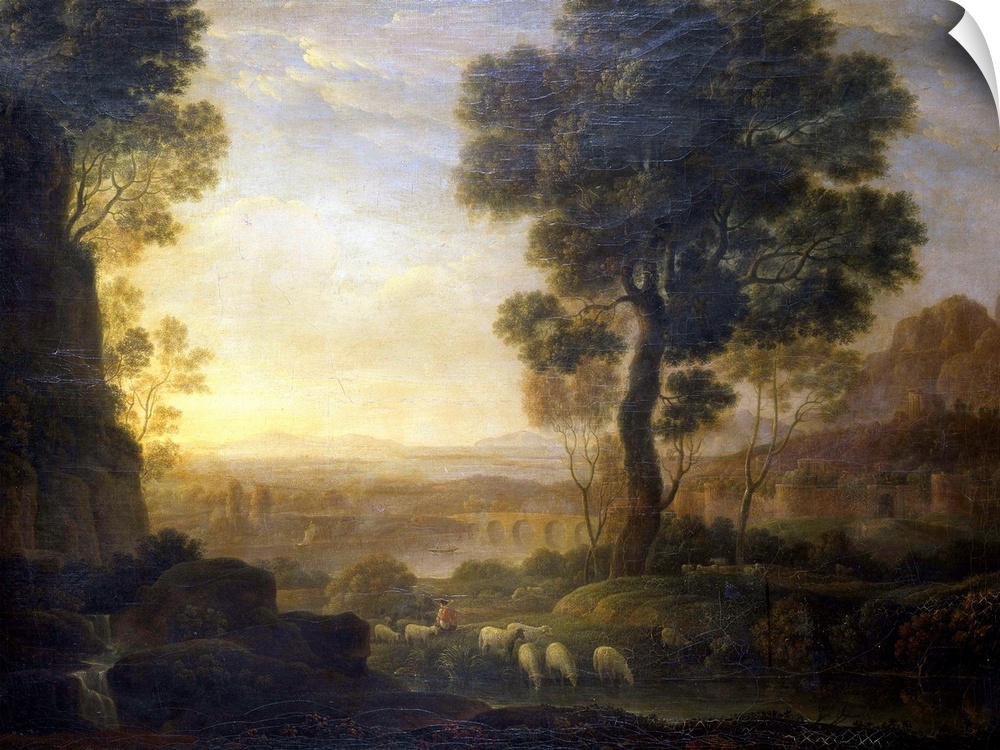<p>Landscape with Flock to the River (Paesaggio con gregge al fiume), school of Claude Gell..e known as Lorrain, 17th Century, oil on canvas, 74 x 98 cm - Italy, Lombardy, Milan, Brera Art Gallery. Whole artwork view. Rural landscape representing a shepherd with a flock of sheeps grazing along the bed of a river between two large trees; in the foreground, on the left, from a high rock falls a small waterfall; nearby, an aqueduct and some buildings; a cloudy sky with soft colours fills the upper side of the painting. - Milan, Italy - 2000/Francesco Tanasi/Electa/Mondadori PortfolioAuthorization required for not editorial use. Please contact Mondadori Portfolio/Mondadori Portfolio courtesy of MiBAC - 2000/Francesco Tanasi/Electa/Mondadori Portfolio/Everett Collection - (1855990)</p>