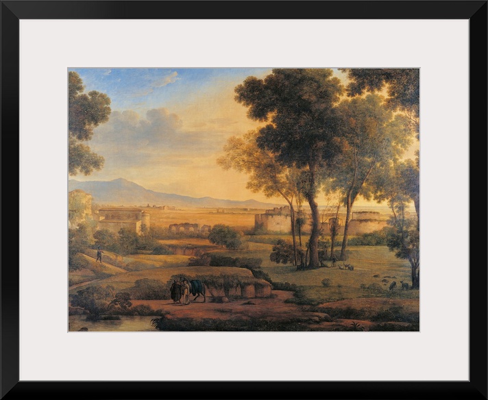 <p>Landscape with Ruins and Pilgrims, by Rosa Mezzera, 1810, 19th Century, oil on canvas, cm 100 x 133 - Italy, Lombardy, Milan, Brera Academy of Fine Art Collections, (on deposit at the Camera dei Deputati. All. Countryside trees figures houses ruins gilded</p>