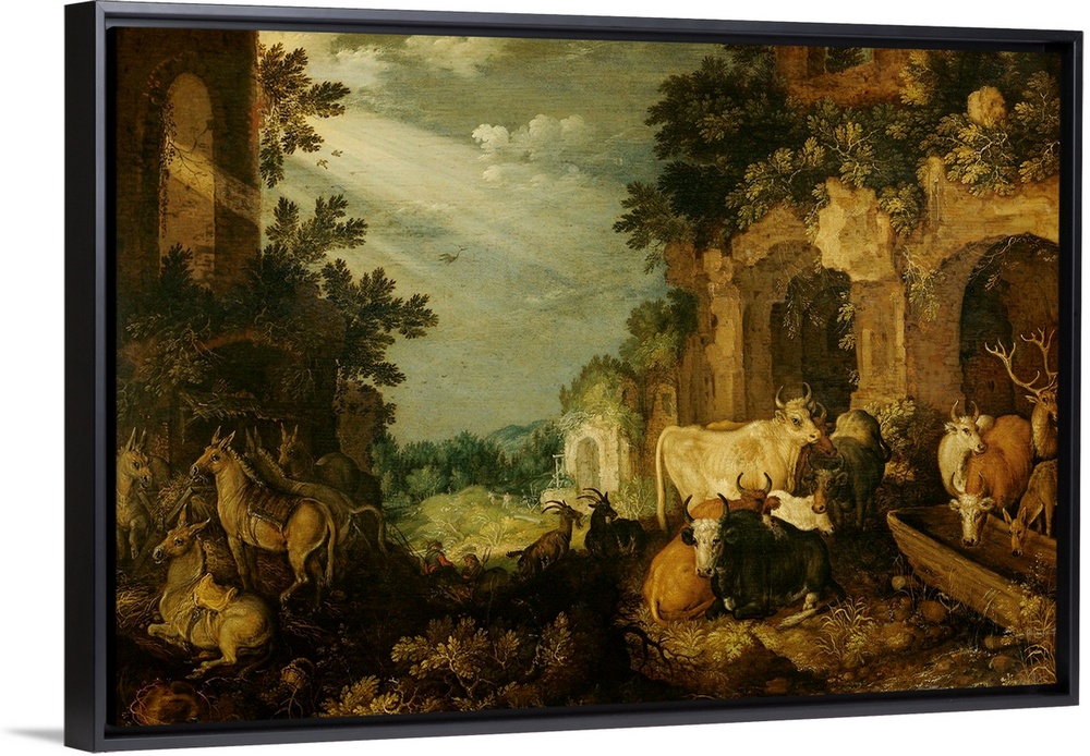 <p>Landscape with Ruins, Cattle and Deer, by Roelant Savery, 1614-20, oil on panel. A buck and doe are at a watering trough with cattle. At left is a group of donkey's. In mid-ground are two goats and reclining herdsmen.</p>