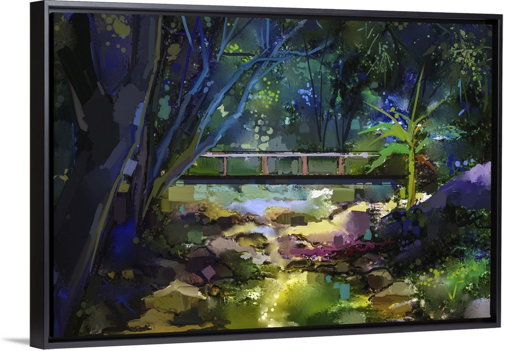 <p>Originally an oil painting landscape with wooden bridge over creek in forest. Originally hand painting of colorful summer nature forest with yellow and green- blue color.</p>