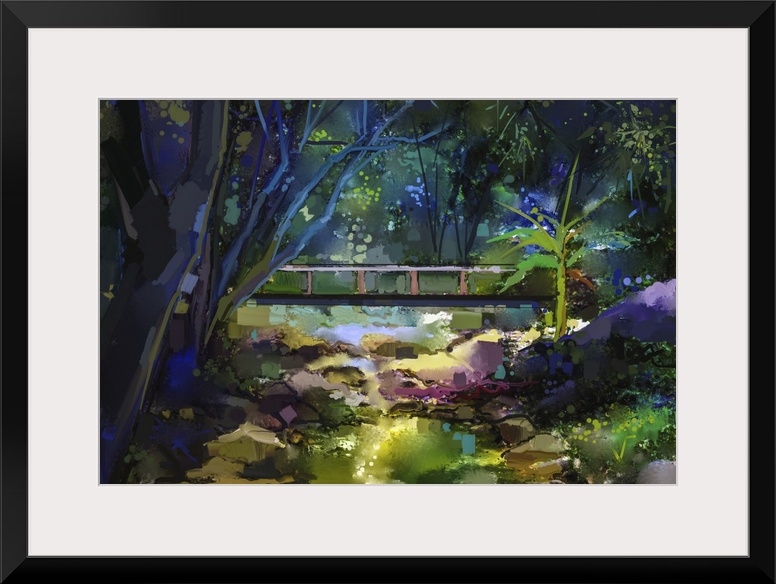 <p>Originally an oil painting landscape with wooden bridge over creek in forest. Originally hand painting of colorful summer nature forest with yellow and green- blue color.</p>