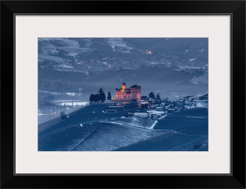 <p>Langhe, Cuneo district, Piedmont, Italy. Langhe wine region winter snow, blue hour at the castle of Barolo</p>